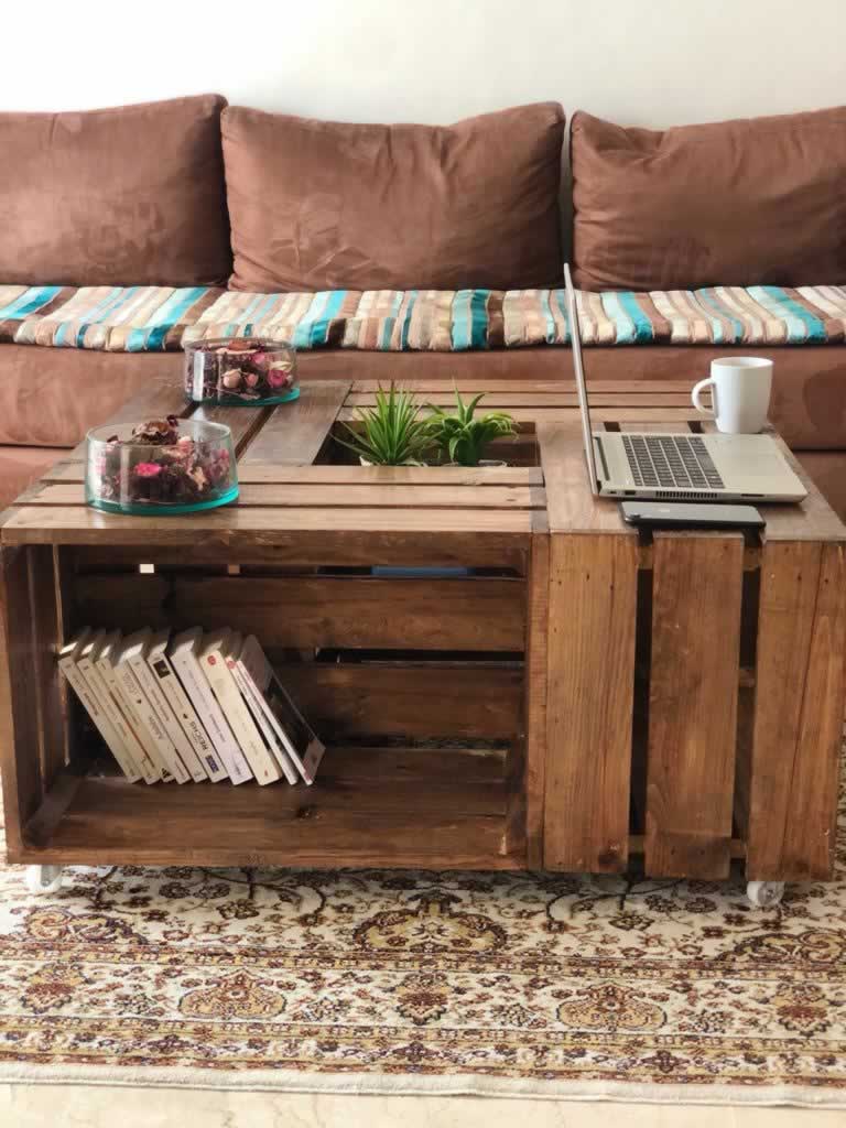 Table en caisses en bois, avec rangements, emplacement pot de plante au centre.